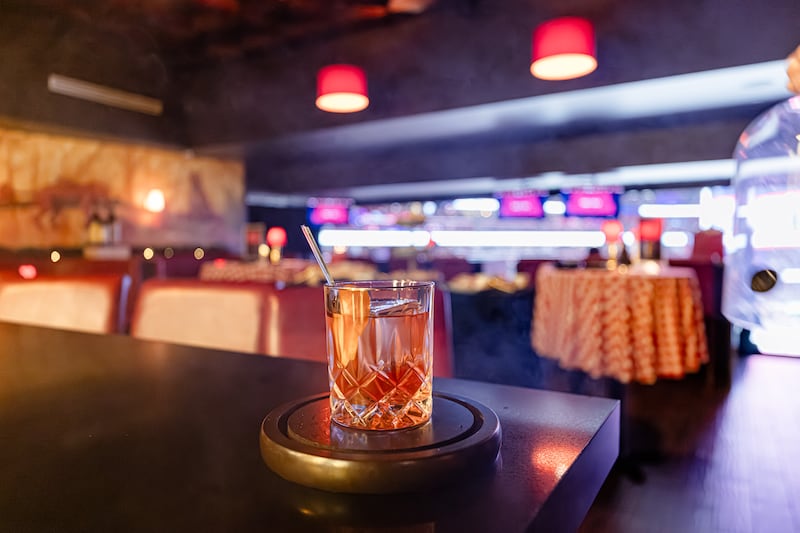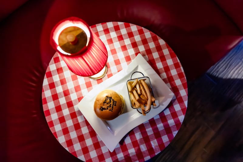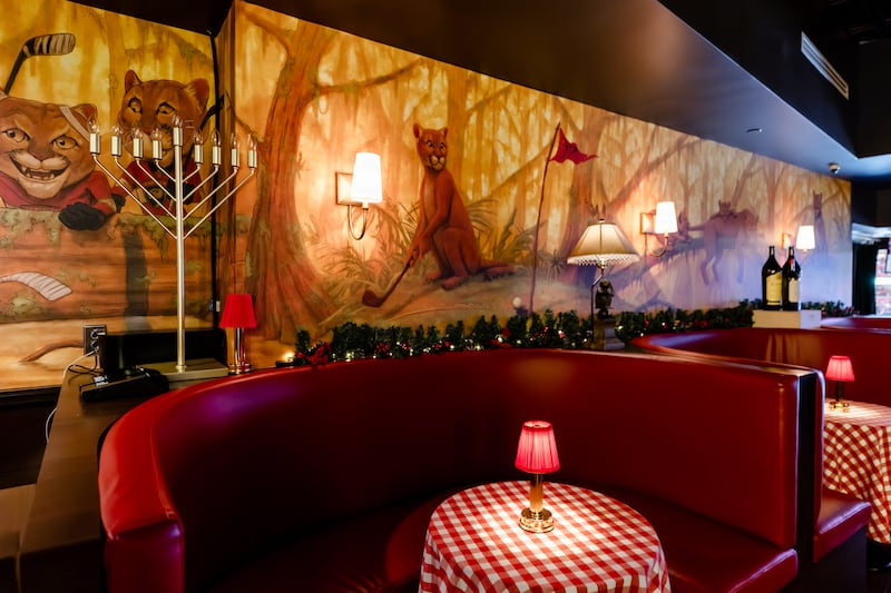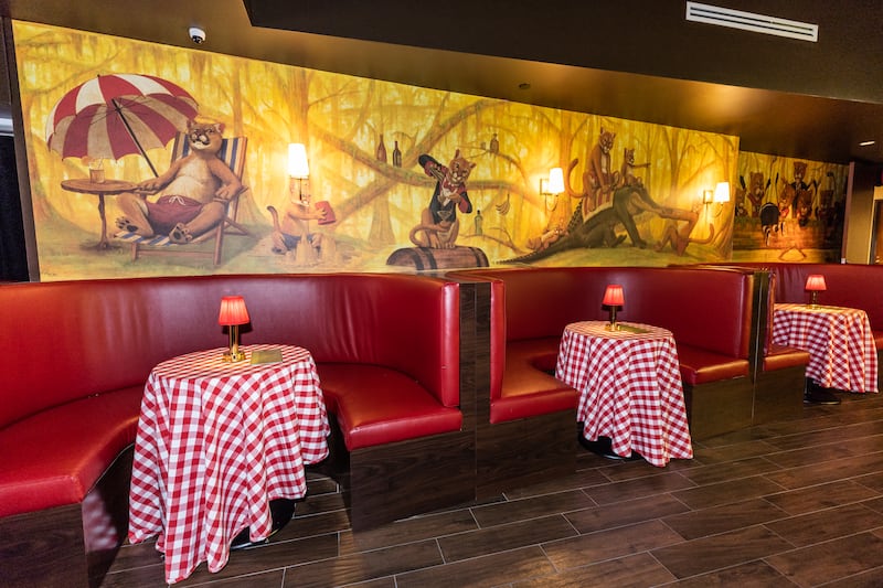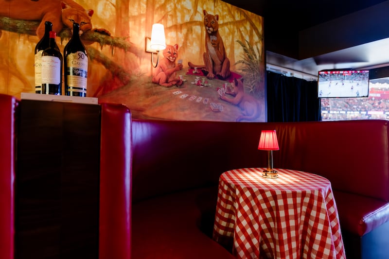 Inside, the aesthetic is classic Italian eatery. A mahogany bar serving signature Old Fashioned cocktails anchors the space, flanked by tufted red leather booths with red-and-white checkerboard tablecloths. Local artist Grant Gruenhaupt hand-painted designs on the club’s walls to match the Manhattan original, only swapping monkeys for panthers.