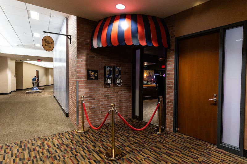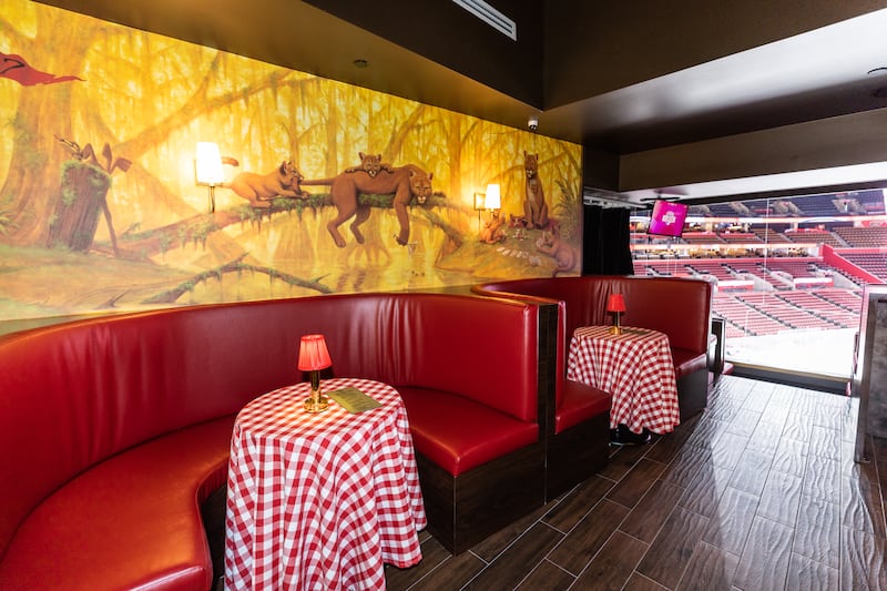 The Panther Club sits on the arena’s suite level, with a velvet rope, speakeasy-type pay phone and small hallway marquee indicating this is not a regular suite.