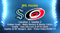 Seattle began a 5-game road trip on the short side Saturday, falling at Carolina 3-2 in NHL play. John Forslund had the call on KONG-TV.