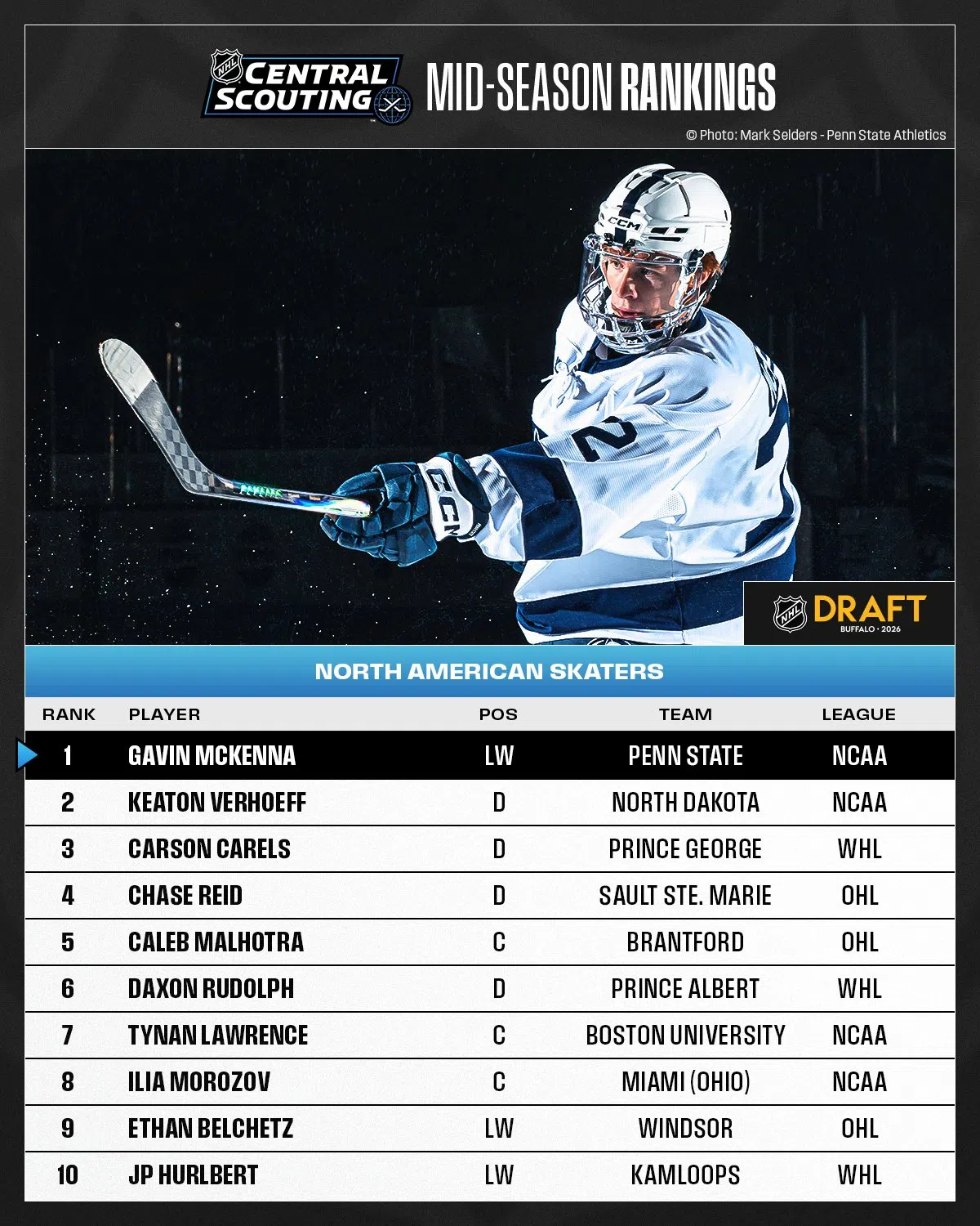 The 2026 NHL Draft will be held June 26–27 at KeyBank Center in Buffalo, with the NHL Draft Lottery to determine the top 16 selections to be announced at a later date. Central Scouting’s final rankings will be released later this spring, leaving room for further movement.