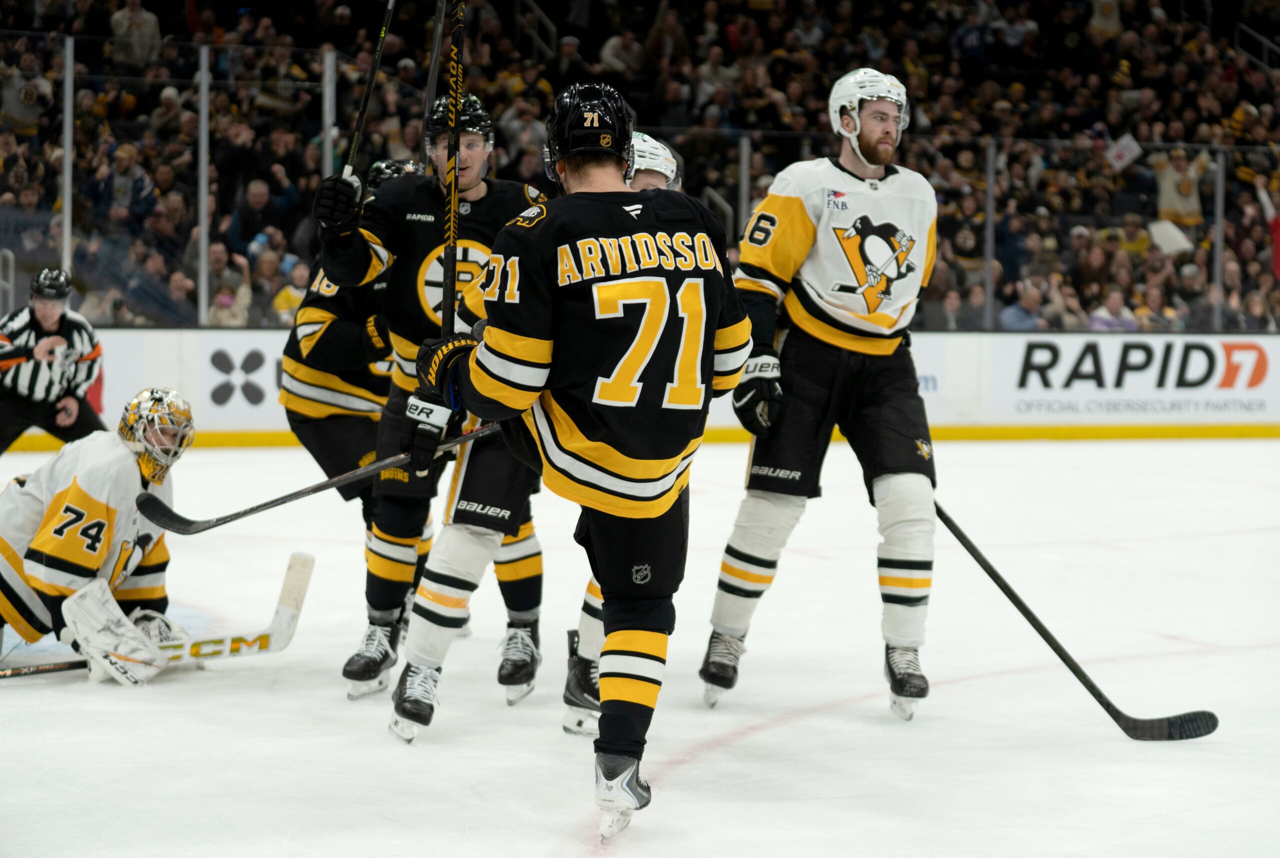 Jan 11, 2026; Boston, Massachusetts, USA; Bruins left-winger Viktor Arvidsson (71) celebrates a score during the first period of the game against the Penguins at TD Garden. (Natalie Reid/Imagn Images)