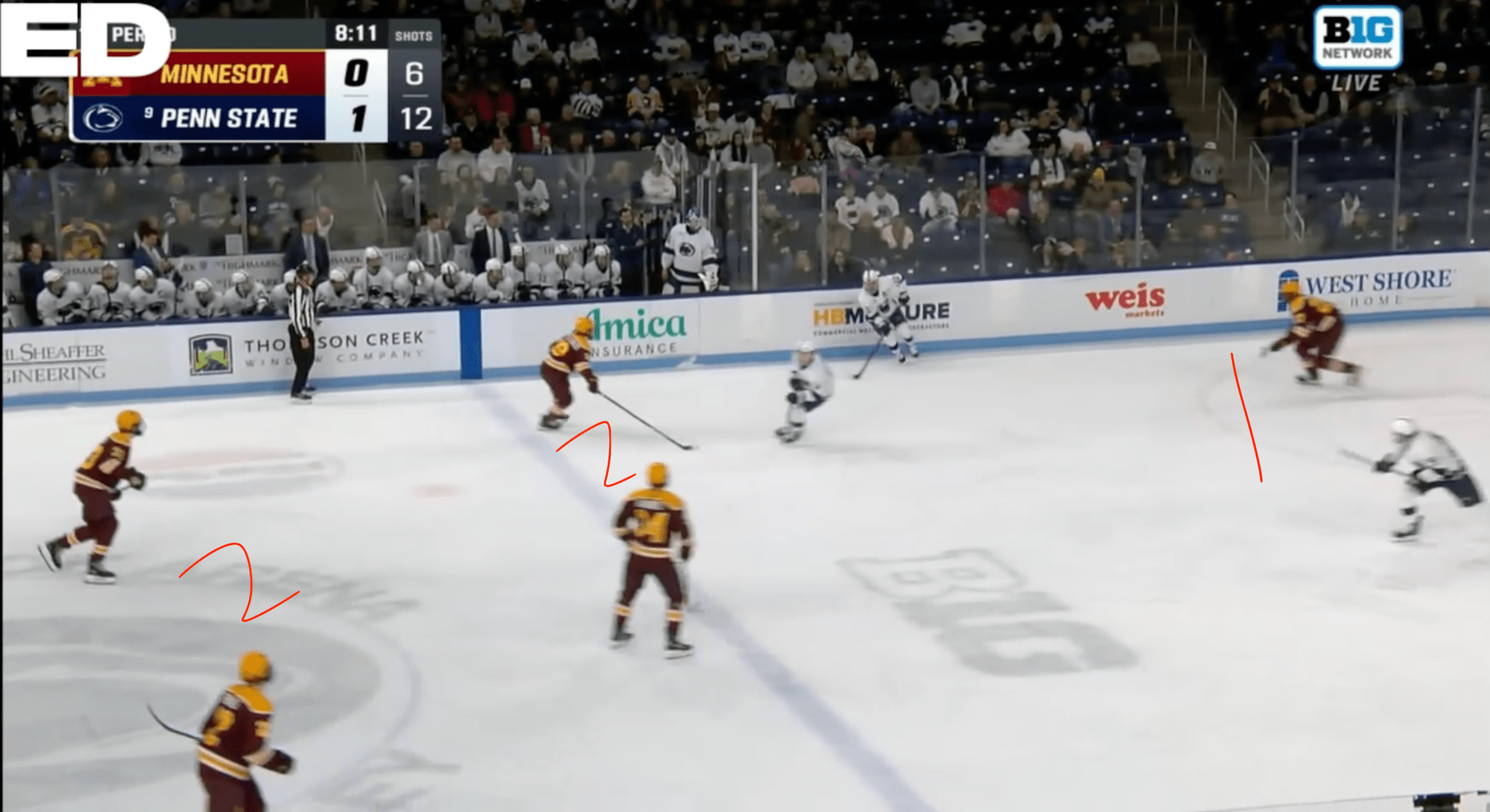 Penn State then begins its own breakout. Mac Gadowsky feeds the puck to Ben Schoen at the half-boards near the bench. Here is the exact moment Schoen is ready to make a decision with the puck, with Minnesota shown in its 1-2-2 formation:
