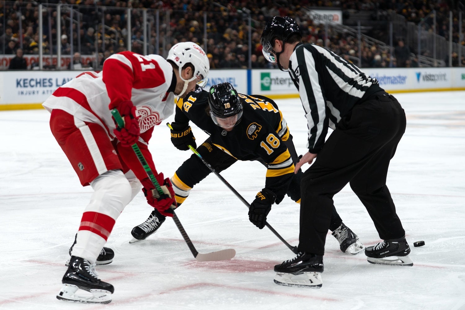 Jan 13, 2026; Boston, Massachusetts, USA; Bruins center Pavel Zacha (18) takes a face-off during the first period against the Detroit Red Wings at TD Garden. (Natalie Reid-Imagn Images)