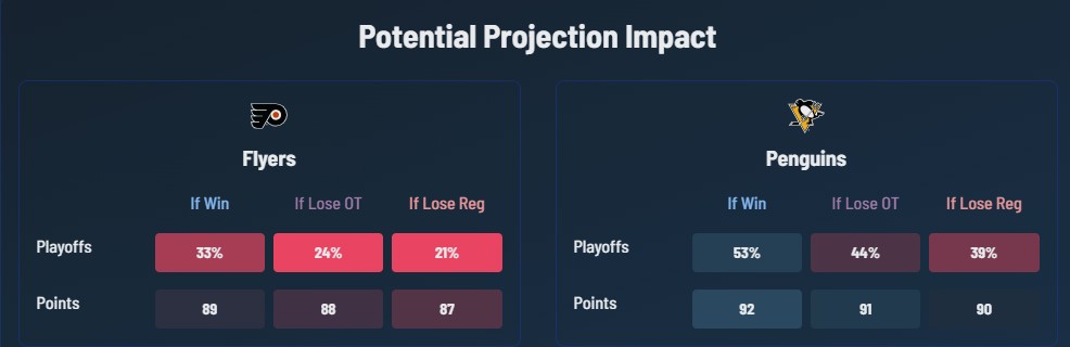 The model on hockeystats.com gives this game up to a 14 point swing for Pittsburgh on playoff outlook, depending on if it’s a regulation win or loss. The stakes are almost as high and even more dire for Philadelphia, whose chances take a very big hit if they were to fall in regulation.