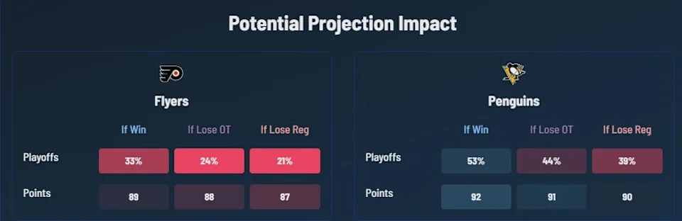 The model on hockeystats.com gives this game up to a 14 point swing for Pittsburgh on playoff outlook, depending on if it’s a regulation win or loss. The stakes are almost as high and even more dire for Philadelphia, whose chances take a very big hit if they were to fall in regulation.