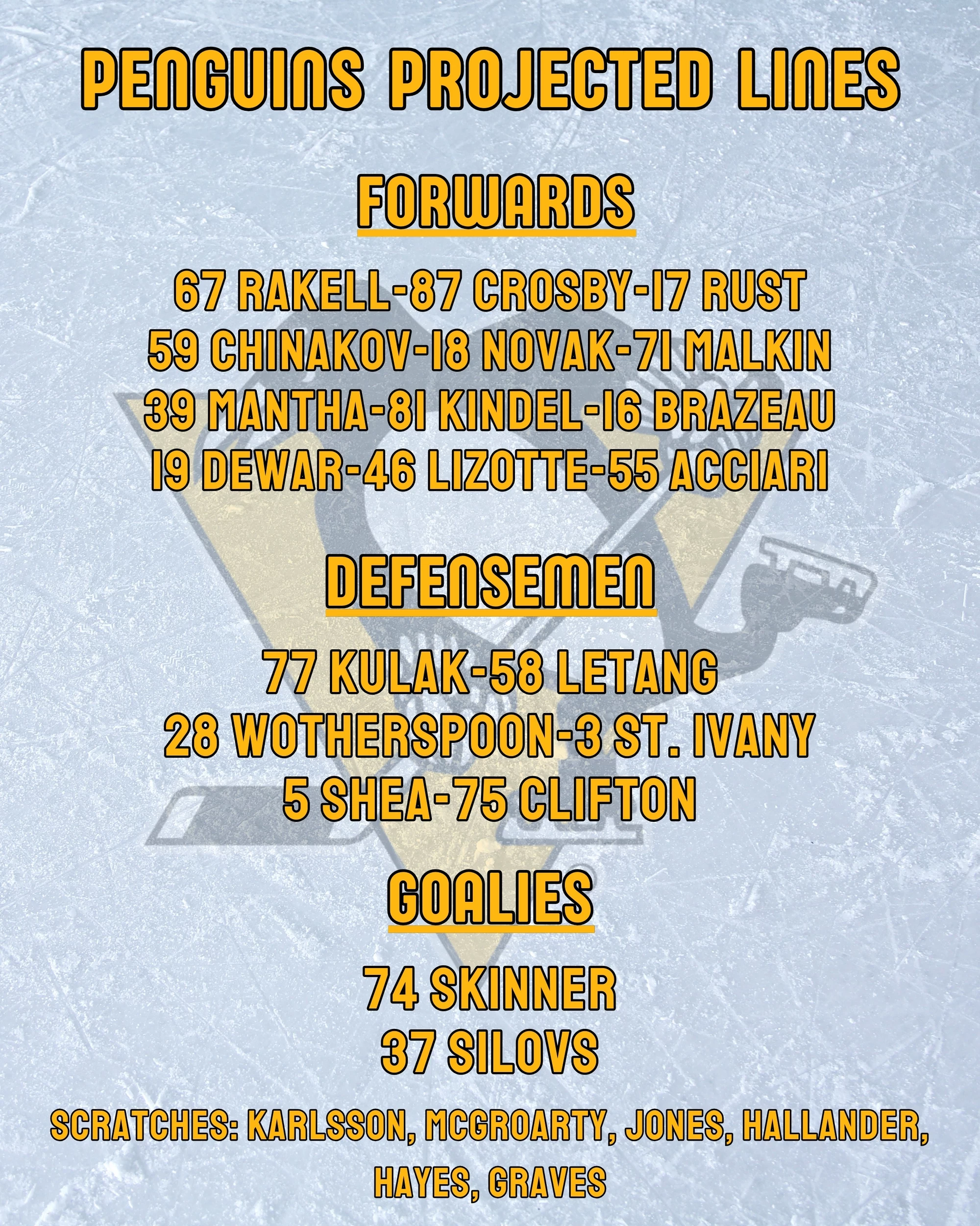 Projected LineupsFlyers Lines 1-15-2026Flyers Lines 1-15-2026Penguins Lines 1-15-2026Penguins Lines 1-15-2026Lineup NotesFlyers: No changes are anticipated to the Flyers’ lineup. The Flyers called up Aleksei Kolosov to serve as backup. Bobby Brink was placed on IR retroactive to Jan. 6. Rasmus Ristolainen was a late scratch on Wednesday and is listed as day-to-day.Penguins: No changes are expected to the Pittsburgh lineup.Flyers-Penguins Game Notes 1-15-2026Flyers-Penguins Game Notes 1-15-2026Where to Watch ESPNWhere to Watch ESPNVideo Preview