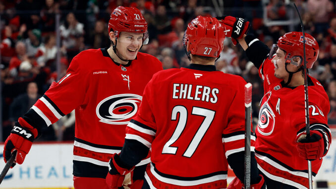 “It felt fantastic, of course,” Ehlers said of his four-point night and first hat trick with Carolina. “To be able to do that at home as well makes it even more special.”