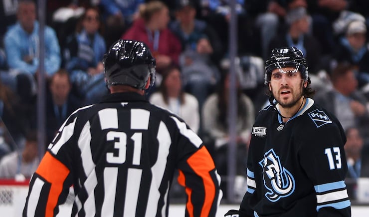 Utah Mammoth left wing Brandon Tanev (13) complains to an official after being called for a penalty during the first period of an NHL game against the Seattle Kraken at the Delta Center in Salt Lake City on Saturday, Jan. 17, 2026. | Rio Giancarlo, Deseret News