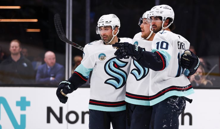 Seattle Kraken center Matty Beniers (10) celebrates with defenseman Brandon Montour (62) and right wing Jordan Eberle (7) after scoring against the Utah Mammoth during the second period of an NHL game at the Delta Center in Salt Lake City on Saturday, Jan. 17, 2026. | Rio Giancarlo, Deseret News