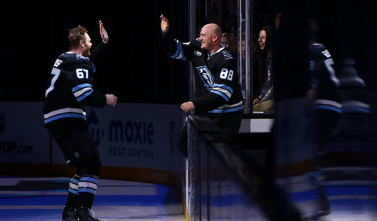 Utah Mammoth defenseman Nate Schmidt (88) high-fives left wing Lawson Crouse (67) during the stars of the game ceremony after the Utah Mammoth defeated the Seattle Kraken 6-3 in an NHL game at the Delta Center in Salt Lake City on Saturday, Jan. 17, 2026. | Rio Giancarlo, Deseret News