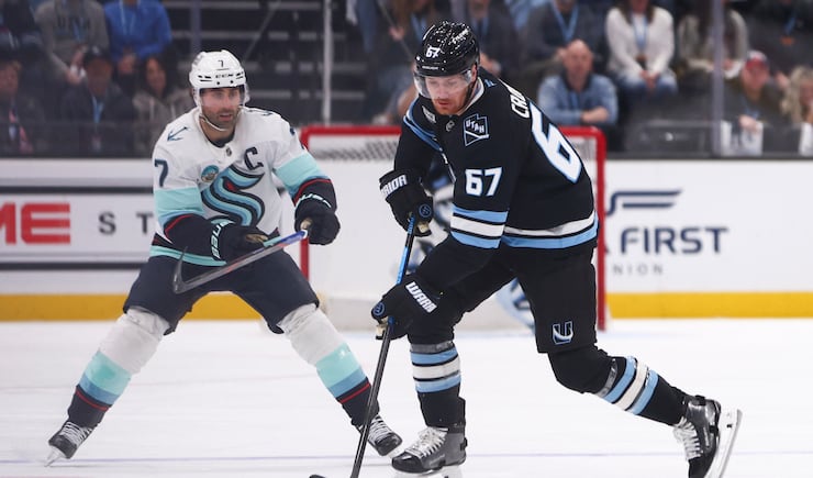 Utah Mammoth left wing Lawson Crouse (67) moves the puck against Seattle Kraken right wing Jordan Eberle (7) during the first period of an NHL game at the Delta Center in Salt Lake City on Saturday, Jan. 17, 2026. | Rio Giancarlo, Deseret News