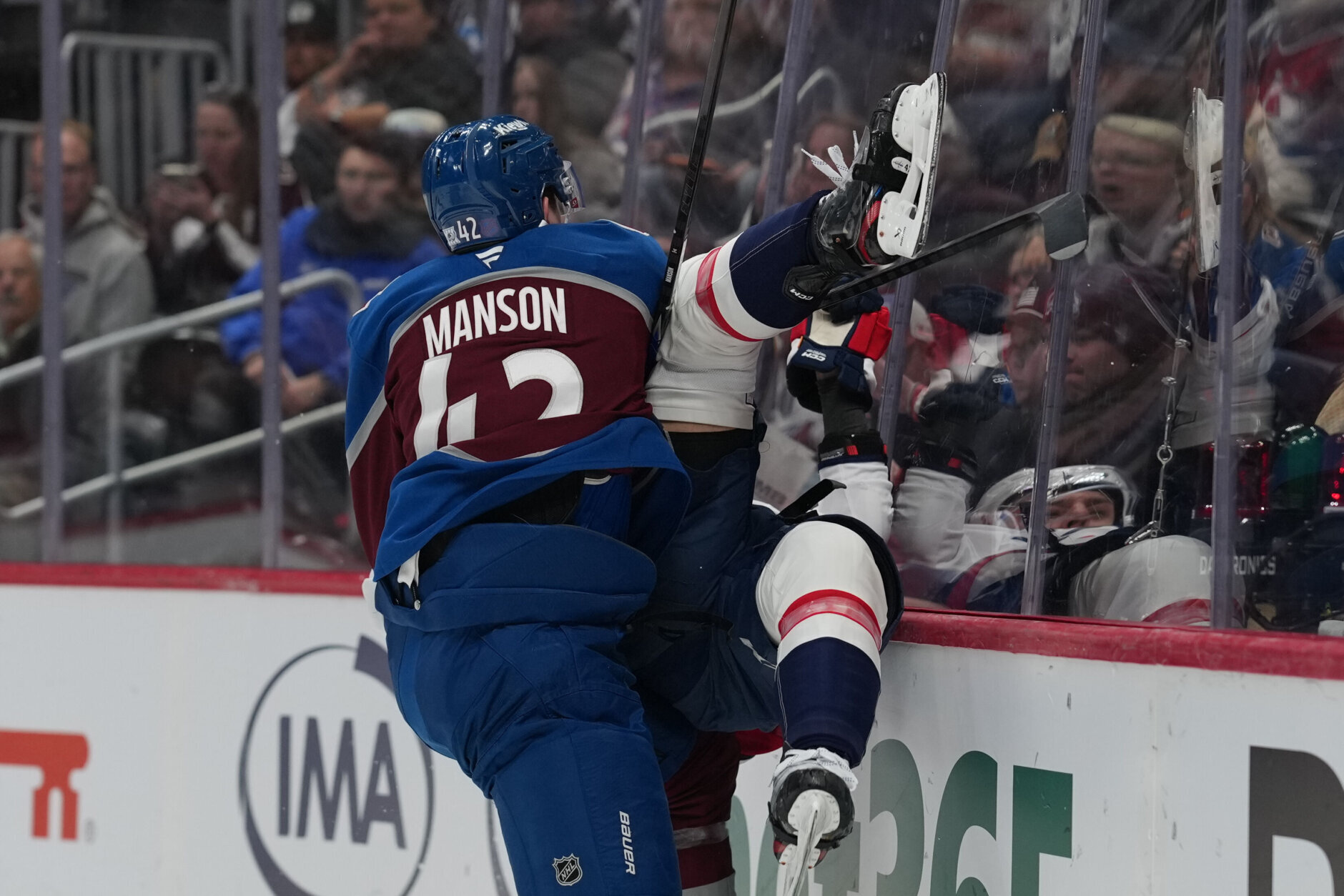 Capitals Avalanche Hockey Colorado Avalanche defenseman Josh Manson, left, delivers a hard check to Washington Capitals left wing Anthony Beauvillier in the second period of an NHL hockey game Monday, Jan. 19, 2026, in Denver. (AP Photo/David Zalubowski)