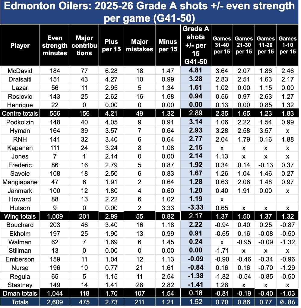 Can they keep it up? When we look at the 10-game splits for Grade A shots plus-minus at even strength, we see many players shooting up, then shooting down. It’s not easy to maintain a high level of two-way play, but it’s excellent news that many Oilers have found their best games. It means they might be able to jack up their performance to a new height for a time when it counts most in the playoffs.