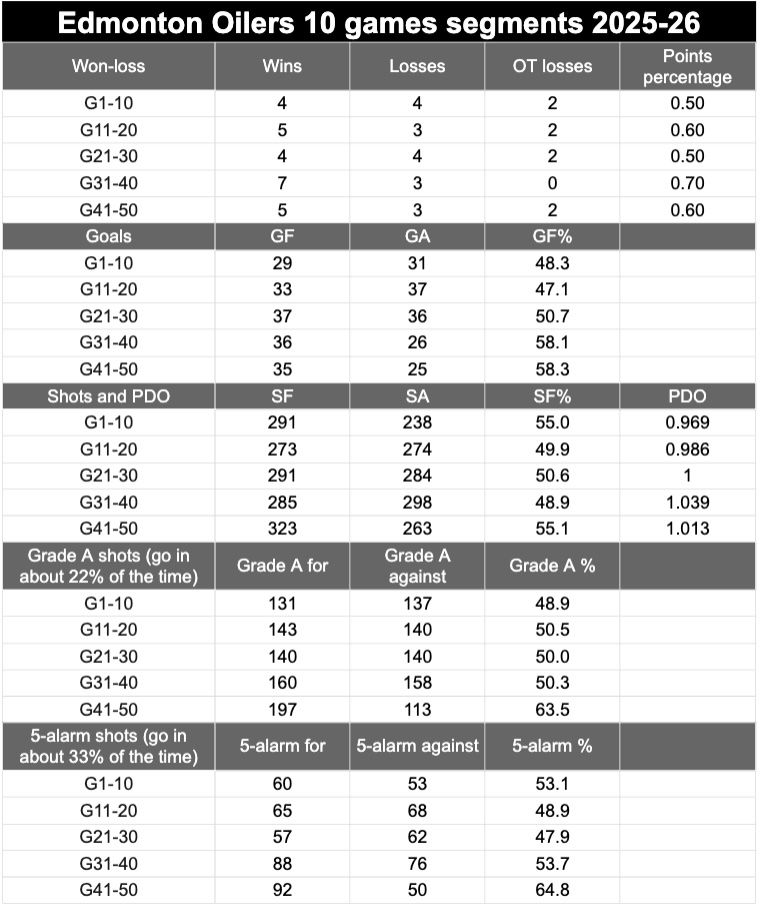 The won-loss record was still five wins and five losses, but the points percentage was 0.6 and Edmonton had a 58.3 Goals For percentage (GF%), its best GF% for any 10-game segment so far this year. Even better was Edmonton’s Grade A shot percentage this segment, a gaudy 63.5 GrAS%. Previously this year the Oilers had given up as many Grade A shots as they had created, but Edmonton’s offensive play has exploded in recent games.
