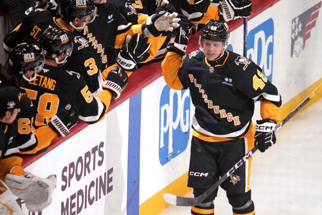 Pittsburgh Penguins’ Valtteri Puustinen (48) returns to the bench after scoring during the first period of an NHL hockey game against the Minnesota Wild in Pittsburgh, Tuesday, Oct. 29, 2024. (AP Photo/Gene J. Puskar)
