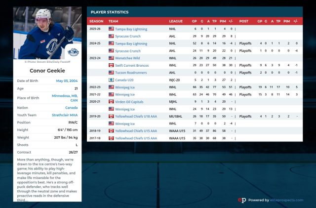 NameConor GeekiePositionCenterAge (as of October 1, 2025)21Height/Weight6’4″, 207 lb.Expected 2025-26 TeamTampa Bay Lightning / Syracuse CrunchDraft – Year, Round2022, 1st Round (11) Arizona CoyotesPrevious Rankings1 (2024)JustinG. Ranking1Final Rank1