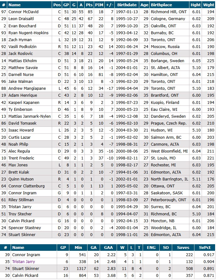 Draisaitl has missed the last three games to travel back to Germany to attend to a ‘family illness’. All the best to him there in what sounds like a tough situation. It was said on Tuesday the star forward would be back ‘this week’ without specifying if that meant against the Penguins tonight or for Edmonton’s next game on Saturday. Haven’t seen much as of press time to clarify that, so we’ll wait and see on that front.I feel like the Oilers use play 11 forward/7 defenseman lineups more often than anyone, and often times with success since usually they can toss extra shifts to McDavid/Draisaitl and become even more dangerous than having a random forward play that time instead. Obviously they haven’t had Draisaitl available for that in recent days, having McDavid is often enough. He played 25:17 in the loss to NJD and leads all forwards in the whole NHL in ice time by averaging 22:57 per game. Enough can’t be said about how much he can impact a game, starting with the entire basic lineup structure of a team.Podkolzin has been coming along riding shotgun lately, he was scoreless last game against NJD but recorded four points in four games before that, and has seven points overall in his previous nine games.Hyman is always that dude when it comes to playing with McDavid as well. Hyman has put up 7G+2A over his last eight games.