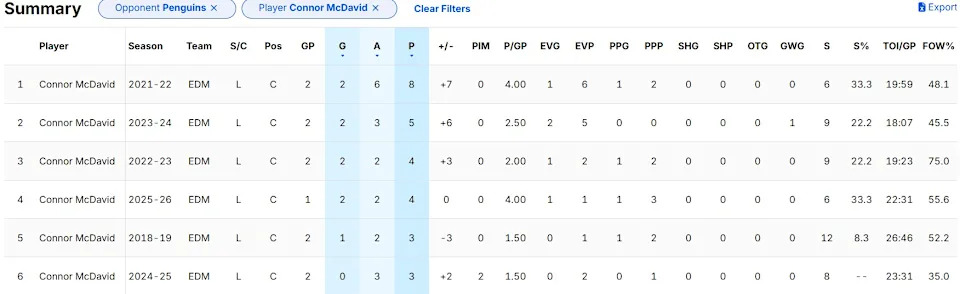 Maybe begging Connor McDavid to stop picking on the Penguins will help? Nothing else has worked, aside from the 2020-21 season when there was no PIT/EDM games due to the scheduling format. His stat-line against the Pens in the last six years is just disgusting.