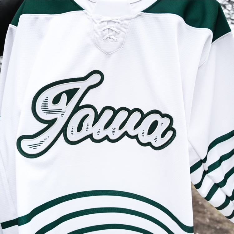 Let’s start with Iowa, the designated home team for the Outdoor Classic game. The Wild will wear predominantly white jerseys with a white script “Iowa” wordmark on the front that has a dark green outline and dark green detailing inside. Each sleeve has seven narrow green stripes starting above the elbow and running down to the cuff, and four more green stripes run around the waist.