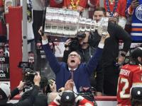 Florida Panthers head coach Paul Maurice lifts the Stanley Cup trophy after Game 7 of the NHL hockey Stanley Cup Final against the Edmonton Oilers, Monday, June 24, 2024, in Sunrise, Fla. The Panthers defeated the Oilers 2-1