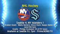 Seattle snapped a 4-game losing streak last night with a 4-1 win over the New York Islanders in NHL play. The game was broadcast on TNT and truTV.