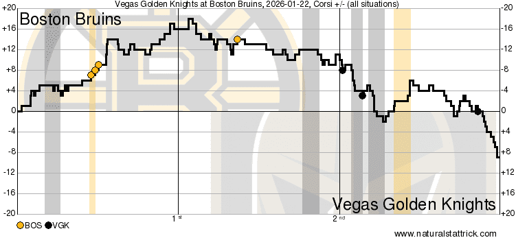 The dominant play would further continue throughout the first period, as Boston posted 14 shots to Vegas’ five. The Bruins also generated 27 shot attempts, compared to the Golden Knights’ 11.