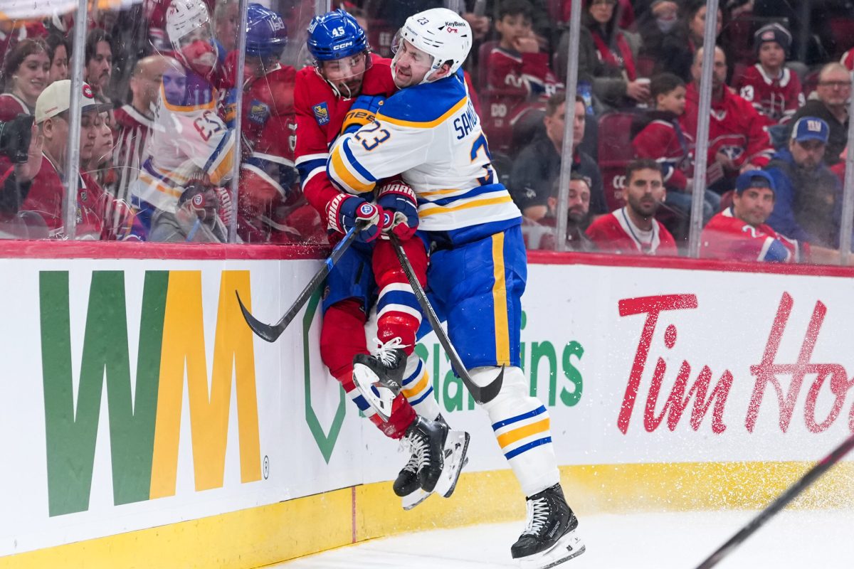 Jan 22, 2026; Montreal, Quebec, CAN; Buffalo Sabres defenseman Mattias Samuelsson (23) checks Montreal Canadiens defenseman Alexandre Carrier (45) during the third period at the Bell Centre. Mandatory Credit: Eric Bolte-Imagn Images