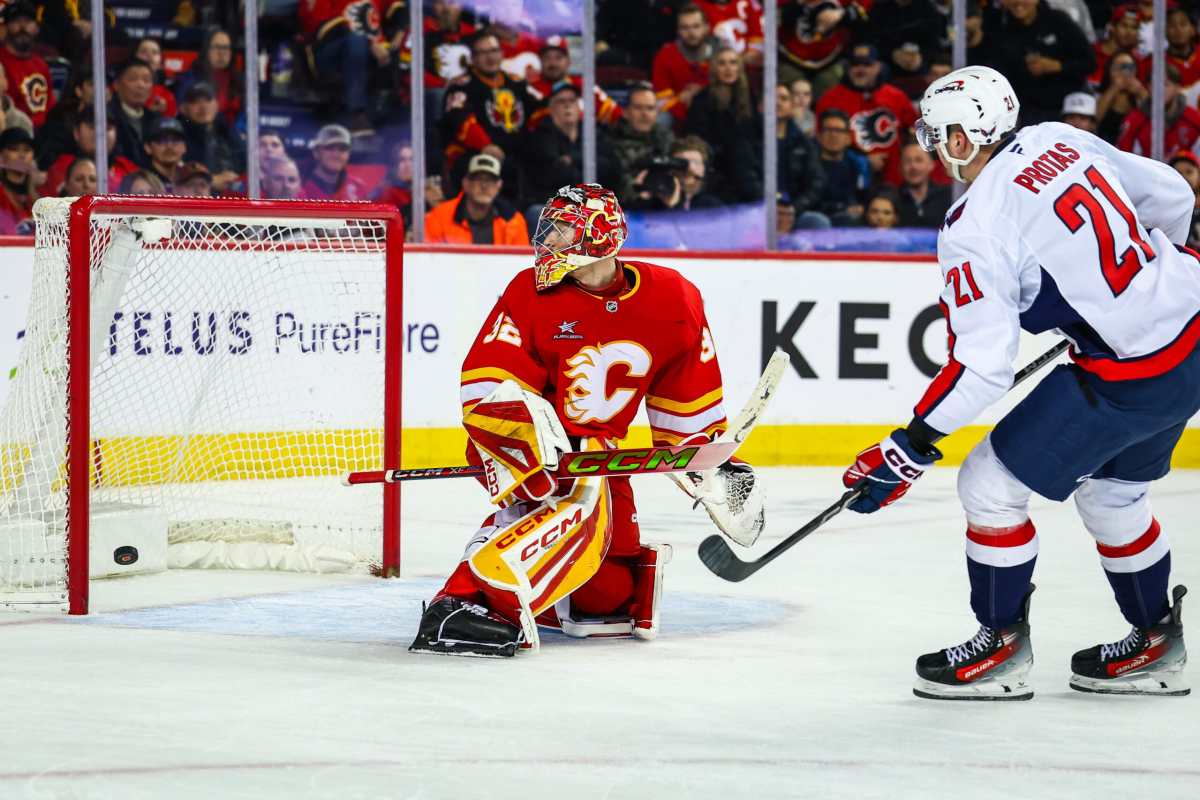 Jan 28, 2025; Calgary, Alberta, CAN; Washington Capitals center Aliaksei Protas (21) scores a goal against Calgary Flames goaltender Dustin Wolf (32) during the third period at Scotiabank Saddledome. Mandatory Credit: Sergei Belski-Imagn Images