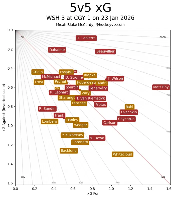 It’s a Team Game – This game was actually one of the Flames better offensive efforts of late, in terms of the quality of chances accrued, but facing a goaltender as good as Logan Thompson is enough of a counter to their skill deficiency it did not matter. Calgary was better early, getting the lead on a power play marker and then keeping up with the aggressive forecheck. They would get the puck into the crease area, have it bouncing around, but nothing they did was good enough to beat Thompson a second time. They had another surge in offensive chances to end the second period, but an early penalty in the third sapped momentum before the Capitals found the go-ahead goal. Devin Cooley had to be sharp himself, because the Flames do not ever earn any real chances without also giving some up these days, keeping them in this thing right until the empty net goal for Ovechkin.