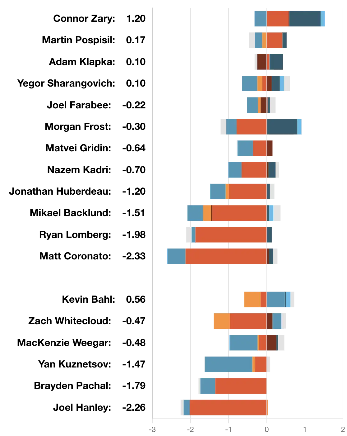 Taken By Chance – Kevin Bahl (45.40 SCF% // 53.93 HDCF%) is very much trying to be the Andersson replacement and to be honest I’m loving what I’m seeing. Having the big guy jumping in the rush, or showing off his skating skills dancing in the attacking zone, has been a delight and something I wish we saw even earlier than this last stretch of games. It earned him involvement in 10 of the Flames 13 high danger chances tonight at 5v5, while seeing only 8 against. He and new partner Zach Whitecloud (39.28 per cent // 48.18 per cent) have been given a lot of heavy minutes and are not sinking by any means. The forwards improving their attack will help the goal differential, but Bahl and Whitecloud are doing their part in getting the offence set up.
