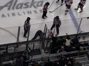 Seattle’s Ryan Lindgren and New Jersey’s Dalton Mercer were called for fighting majors at 10:26 of the first after Lindgren dished a leveling hit on Ondrej Palat.