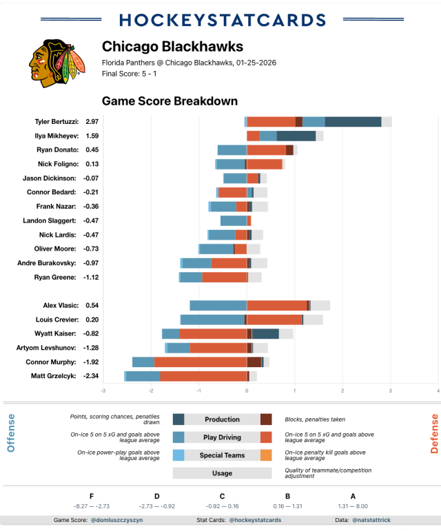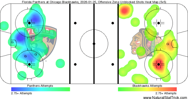Unfortunately, despite a strong start to the third period and a decent push after the third goal, defensive breakdowns and miscues began to pile up, and there were some unlucky breaks too, leading to a few too many goals against. The Blackhawks held a 12-8 edge in attempts and 57.51 percent of the expected goals, but the Panthers limited them to just five shots on goal and only one high-danger chance. Not ideal, especially when chasing most of the period.