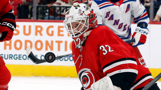 Hurricanes goaltender Brandon Bussi makes a save during a Dec. 29 game against the Rangers in Raleigh. (Karl DeBlaker / AP Photo)