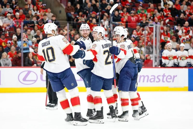 Tobias Bjornfort and the Florida Panthers celebrate a goal in their 5-1 victory over the Chicago Blackhawks at the United Center on Sunday. (Photo courtesy of The Hockey News)