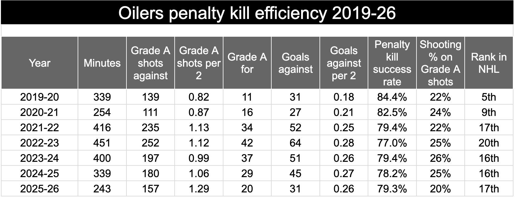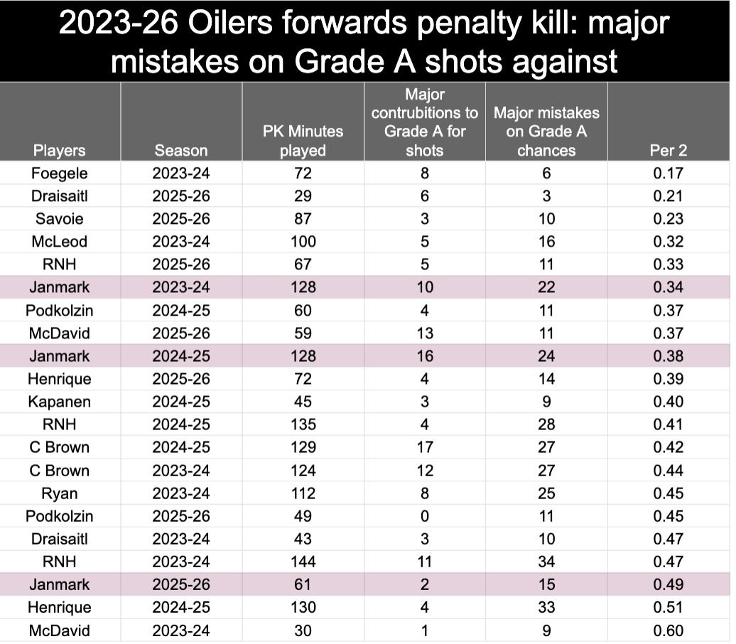 So far this year in 2025-26, he’s at 2 for, 15 against. Of the regular forwards on the PK, he’s the one with the highest rate of mistakes on Grade A shots against.