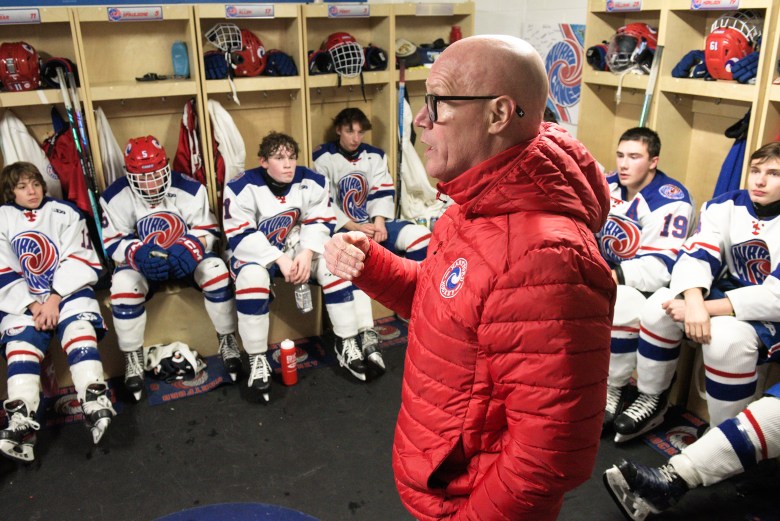 Hartford Head Coach Todd Bebeau tells his team he recognizes their effort in the second period after giving up two unanswered goals to Woodstock in the first, and challenges them to make it a one-goal game in the final period in White River Junction, Vt., on Wednesday, Jan. 29, 2026. Colin Morlock, 19, scored with 2:39 left of play, and Bebeau pulled the goalie to close out the game with a six-player offense, but the Wasps held on to win 2-1. JAMES M. PATTERSON / Valley News