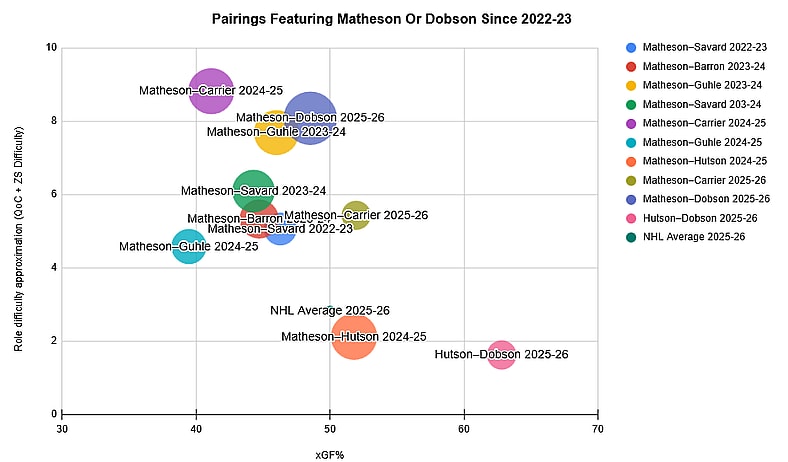 The Matheson–Dobson pairing has been playing together for the whole season, except for the two mid-December games where Dobson was set up to play with Lane Hutson, and for the three games that Matheson missed with injuries. They’ve been trusted with one of the hardest deployments in the entire NHL, and only 8 pairings have played more together this season. To help them with their difficult job, they’ve also had the chance to play with the top Montreal Canadiens players more than any other defencemen.
