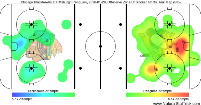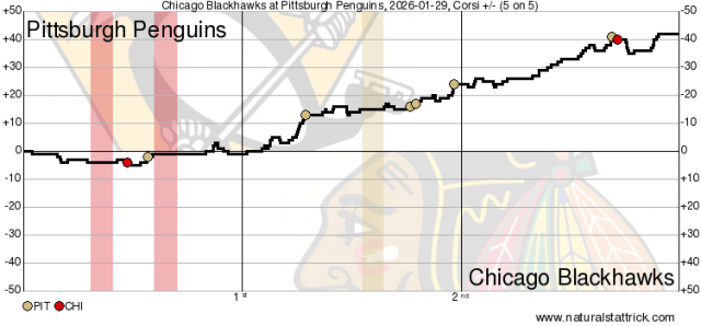 The third period picked up right where the second left off, with the Blackhawks barely hanging on as the Penguins ran all over them. There isn’t much need to dive deep here, because the shot metrics tell the story clearly: the Blackhawks were once again on the losing side of attempts (30-12), shots on goal (13-5), chances (16-9), and expected goals (29.08 percent) by a fairly wide margin.