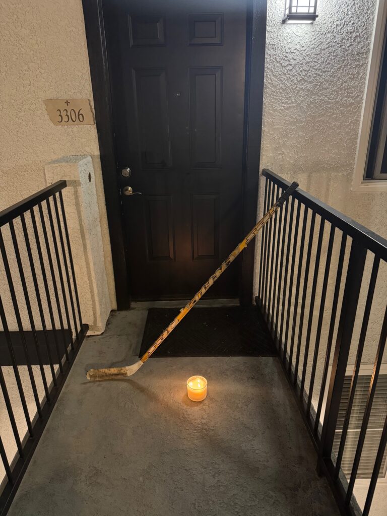 Outside of the team locker room Friday, a sole hockey stick leaned against the door, illuminated by a candle in remembrance of Lorenzana-Villegas and the family members who were injured.