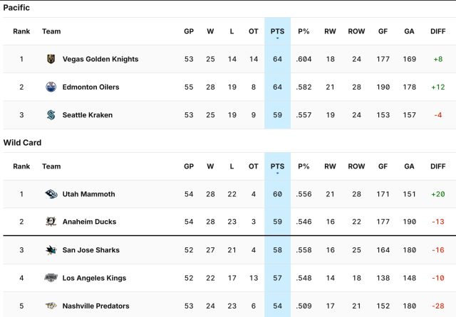 While San Jose is outside looking in, today is one of those games in hand against Anaheim, so San Jose could leapfrog the Ducks. Meantime, the Utah Mammoth are playing the Dallas Stars, and the Seattle Kraken are playing the Vegas Golden Knights, which means the Sharks have the very real possibility of jumping all the way to third in the Pacific Division with a win today. Just something to think about as you’re scoreboard watching today.