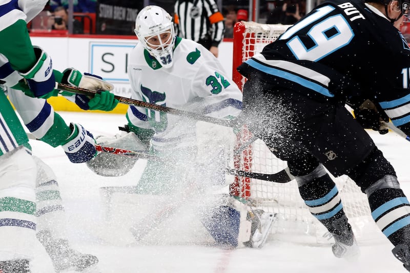 Carolina Hurricanes goaltender Brandon Bussi (32) watches the puck controlled by Utah Mammoth’s Daniil But (19) during the first period of an NHL hockey game in Raleigh, N.C., Thursday, Jan. 29, 2026. (AP Photo/Karl DeBlaker) | AP