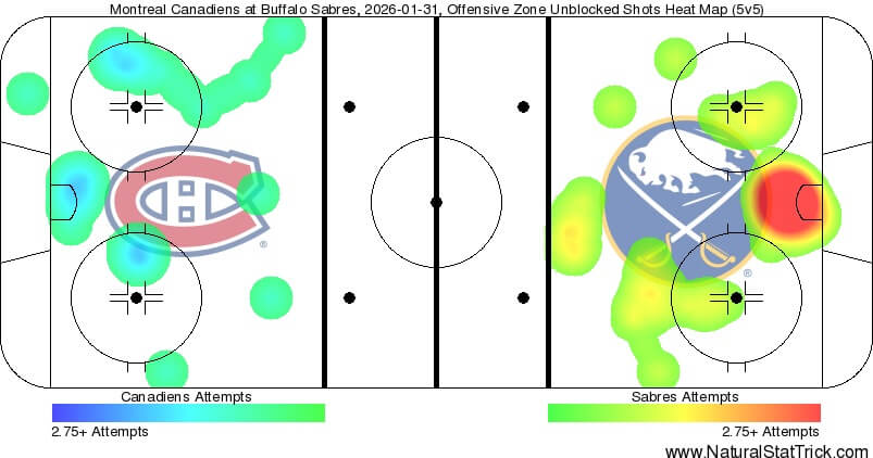 The Canadiens trailed the Sabres 2-1 through 40 minutes Saturday and, as this heat map from Natural Stat Trick demonstrates, were not getting shots off from the areas of the ice necessary for scoring. On at least two occasions in the first two periods, Alex Lyon gave up a rebound that just sat in a very dangerous spot, and the Canadiens were simply unable to get to it.