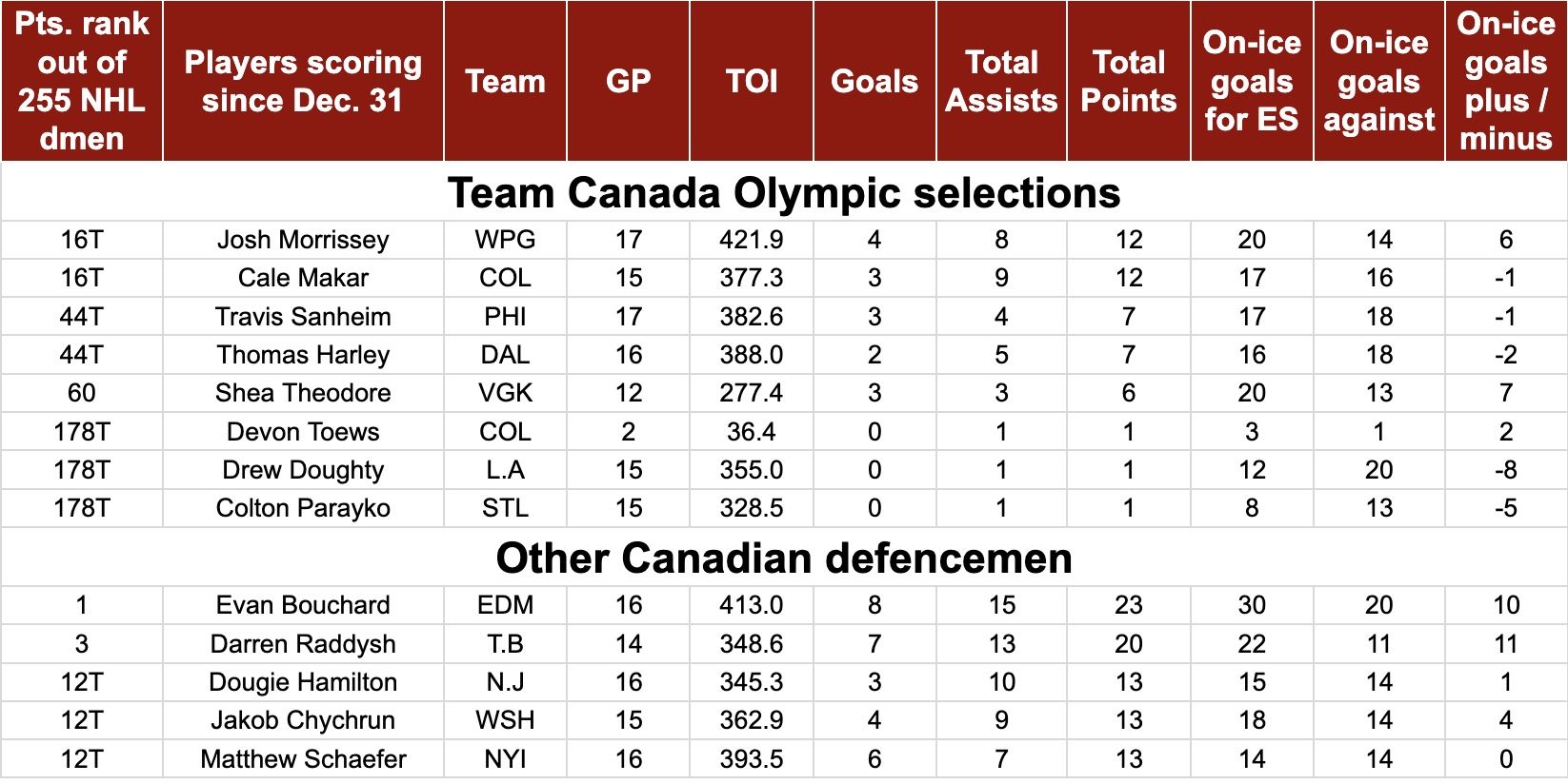 On December 31, 2025, Team Canada named eight d-men to its Olympic roster. Since that time, d-man Evan Bouchard of the Oilers has the same number of points as six of the eight combined.