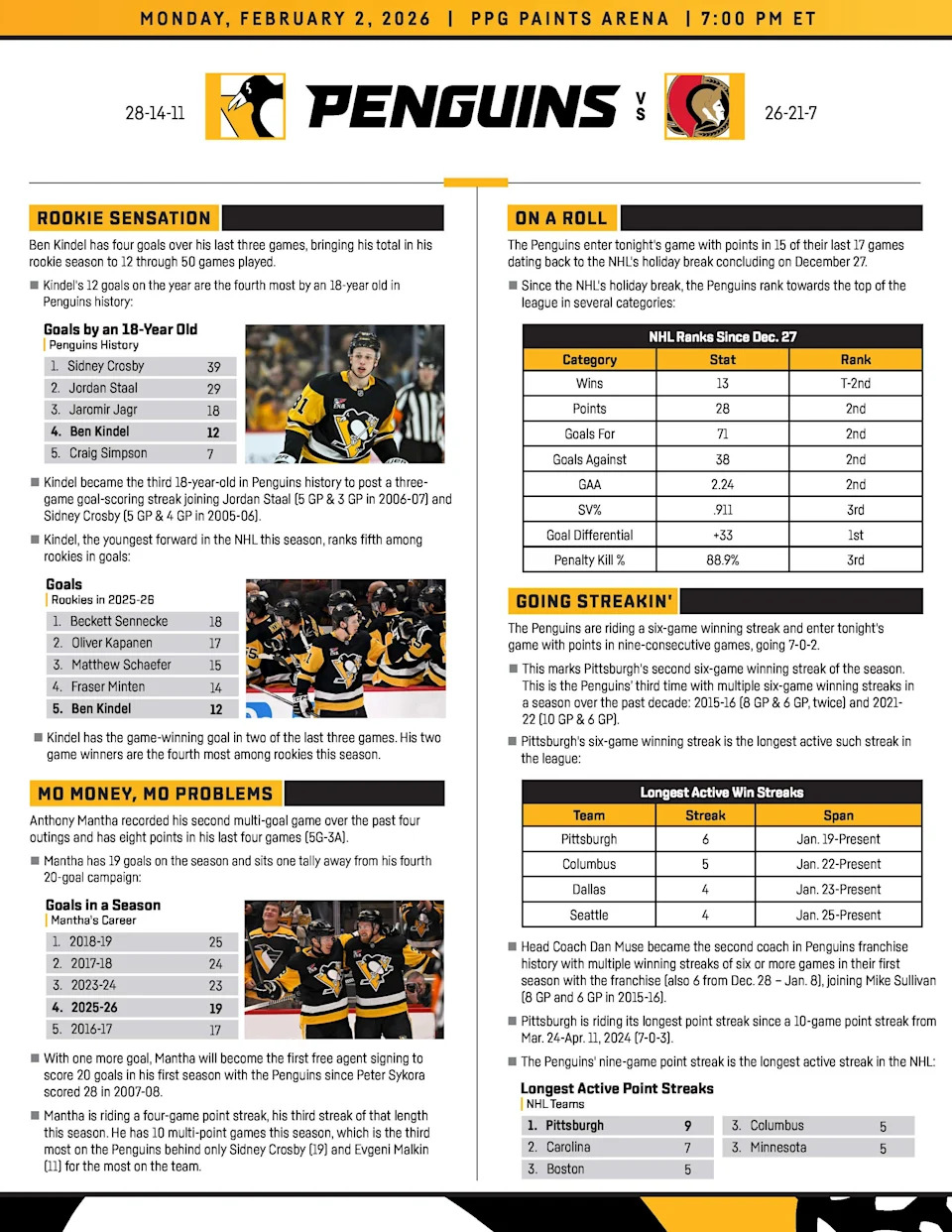Season Series: Ottawa won a 4-0 game back on December 18th in the first matchup of the year. After tonight, the Pens go back to Ottawa on March 26th for the third and final game.