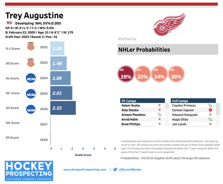Augustine is an ideal hedge within the organization. His development curve continues to trend upward, even if it lacks the flash of Cossa’s profile, and his composure and tracking stand out in big moments. Hockey Prospecting is more conservative on Augustine, currently assigning him a 38% chance of becoming an NHLer, but that number may undersell how projectable his game is at higher levels. In deeper leagues, this is exactly the type of asset to acquire while he remains slightly overshadowed, as Detroit’s system is increasingly positioned to produce at least one long-term answer in goal, and Augustine’s path to relevance remains very much alive.