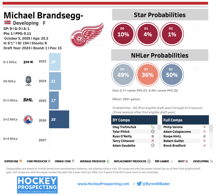 Brandsegg-Nygård offers an enticing mix of size, competitiveness, and pro-ready habits, and his transition to North America has gone smoothly so far. Drafted in 2024, he has already logged nine NHL appearances, unusually early for a Red Wings prospect, and his AHL production has been solid in his first professional season. That combination of early NHL exposure, respectable AHL numbers, and physical profile has helped prop up his dynasty value, especially in leagues that favor power forwards or reward hits and effort-based play.