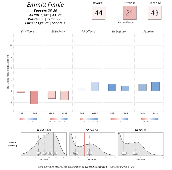 Finnie increasingly looks like a long shot rather than a future lineup staple. His strong peripheral coverage, well over a hit per game, does give him a usable floor in banger formats, but his Evolving Hockey player card is concerning, with both offensive and defensive impacts grading out below average. That combination makes it difficult to envision him earning consistent ice time in scoring situations, especially as more complete and possession-driving prospects move ahead of him on the depth chart. If his junior production or early-season momentum is still inflating his perceived value, this is a reasonable window to sell before the gap between fantasy usefulness and real offensive upside becomes clearer.