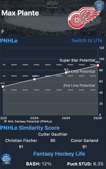 The recommendation to sell here is not a judgment on his overall quality, Plante is unquestionably a very good player, but rather on relative value and timing. His stock right now is arguably as high as it will ever be, and it is unlikely that his true long-term projection will match a pNHLe of 89. More realistic NHL comparables at this stage skew toward players like Christian Fischer or Conor Garland, solid contributors but not perennial top-line scorers. That said, there is still an outside path where Plante could take a leap akin to Cutter Gauthier if everything breaks perfectly. If you can secure Gauthier-like value for him on the high end of his current market range, selling now while his perception and production are peaked makes strategic sense. If you aren’t getting close to that full value, holding for a little longer isn’t unreasonable, but patience should be paired with pragmatic valuation.