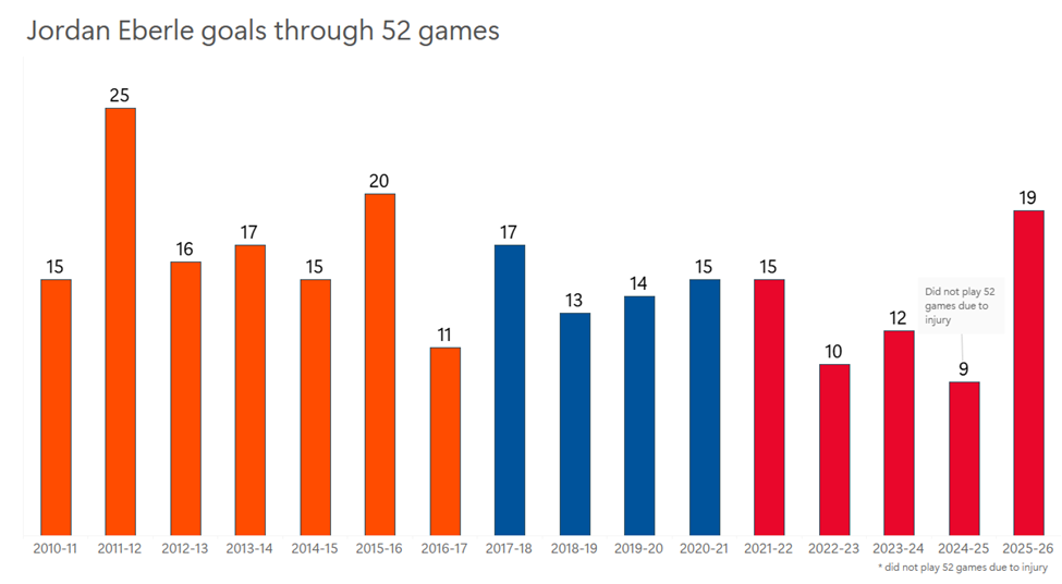 Speaking of scoring, you could make a case that Jordan Eberle has been the team’s most valuable player this season. He’s been a steady contributor while others have missed time, and he’s on pace for one of his best goal‑producing seasons since 2015–16. That’s not bad for a 35‑year‑old winger coming off a brutal injury last season.