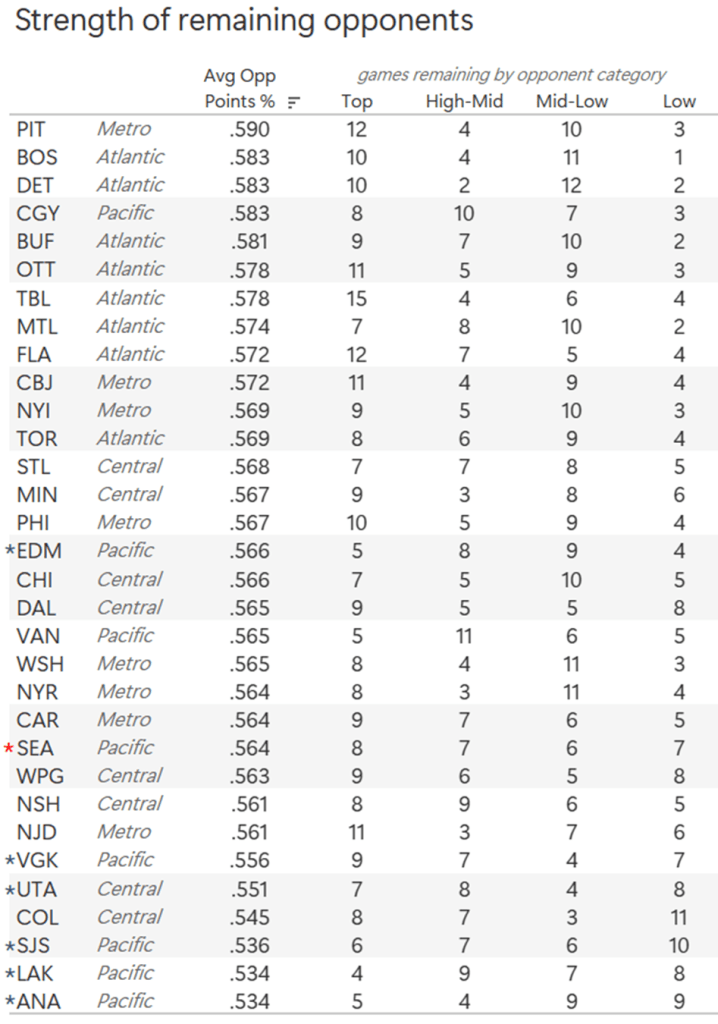 By this measure, the Kraken have a relatively manageable schedule remaining, but compared to their Pacific Division counterparts, theirs is still tougher. It’s not a perfect method, and I’m not sure one exists, but we’ll revisit it as the season progresses.